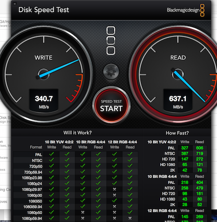 Update zum Speed der Festplatte Wie vermutet war es eher ein Issue des BlackMagic Tools. Apple nutzt wohl bei der SSD eine Art Optimierung und die volle Performance kommt erst wenn man ein paar Zyklen abwartet. Ich hab den Test mal etwas laufen lassen und dann hab ich die Werte erhalten die ich auch erwartet hatte.